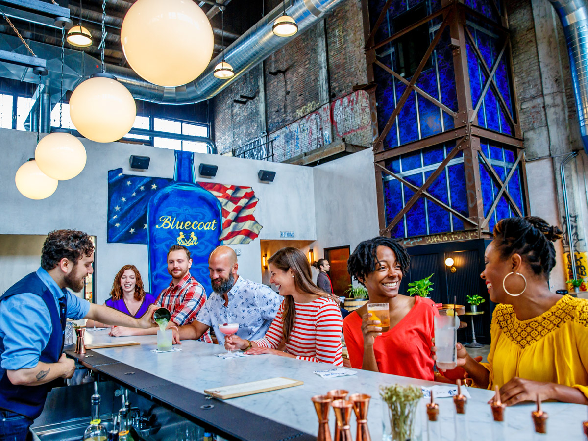 (267) 928-4650, newlibertydistillery.com - Philadelphia Distilling – An old Fishtown factory houses Philly’s first post-Prohibition distillery, which employs hand-hammered copper stills and Hall-Woodford wooden fermentation vessels to create batches of Bluecoat American Dry Gin, Bluecoat Barrel Finished Gin, Vieux Carré Absinthe, Penn 1681 Vodka and THE BAY Seasoned Vodka (with traditional Chesapeake Bay seasonings). The distillery offers a full bar and restaurant with an outdoor patio, a “Best of Philly” award-winning tasting room and retail store. 25 E. Allen Street, (215) 671-0346, philadelphiadistilling.com